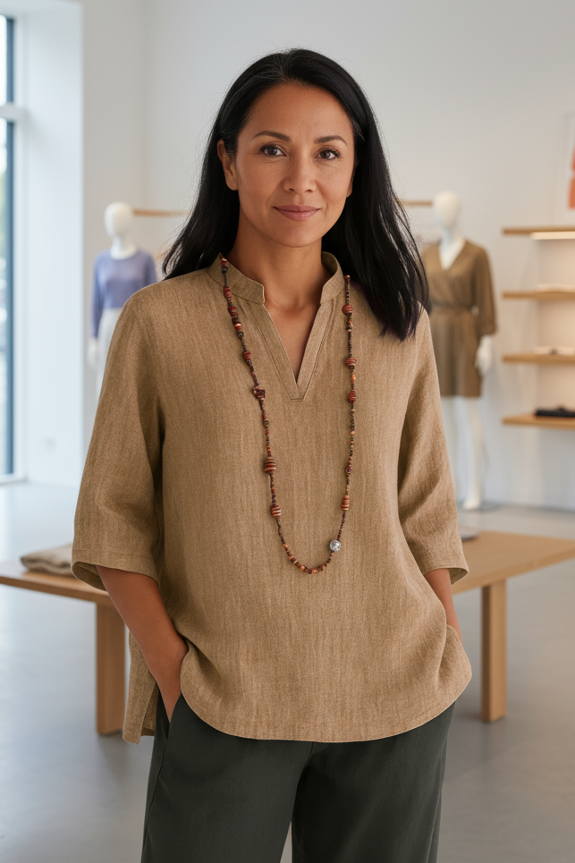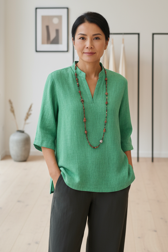 Diese lockere Leinenbluse in leuchtendem Grün vereint zeitloses Design mit natürlichem Tragekomfort. Ob für entspannte Freizeitlooks, sommerliche Ausflüge oder das Homeoffice – sie ist ein echter Allrounder für warme Tage.