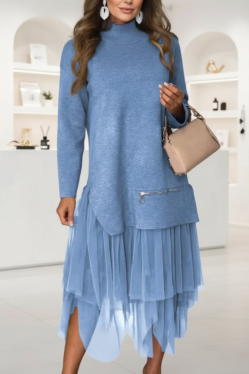 Dieses elegante Kleid vereint weichen Strick mit fließendem Tüll und schafft so einen außergewöhnlich femininen Look. Der hohe Kragen sorgt für Wärme, während die verspielten Lagen und die zarte Transparenz des Rocks für Leichtigkeit und Bewegung sorgen. Perfekt für stilvolle Auftritte im Alltag oder besondere Anlässe.