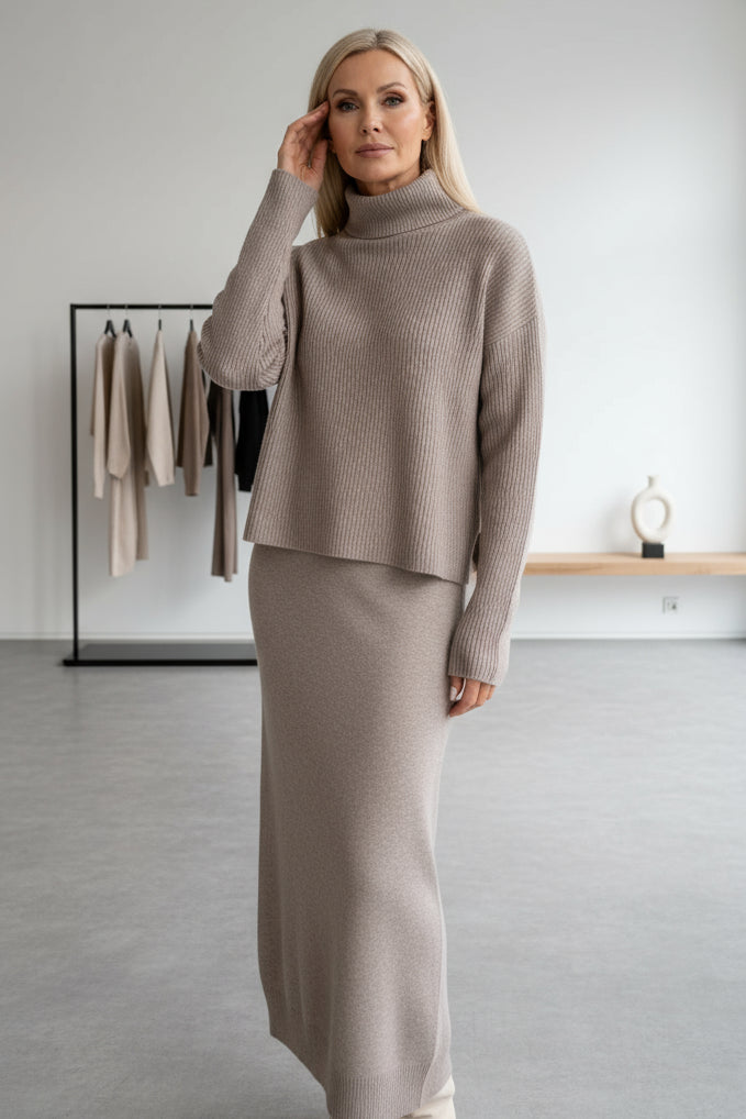 Dieses zweiteilige Set besticht durch minimalistisches Design und maximale Eleganz. Der leicht verkürzte Rollkragenpullover harmoniert perfekt mit dem figurumspielenden Midi-Rock und sorgt für einen stilvollen Look mit moderner Silhouette.