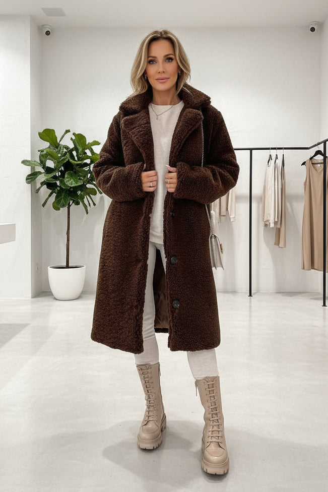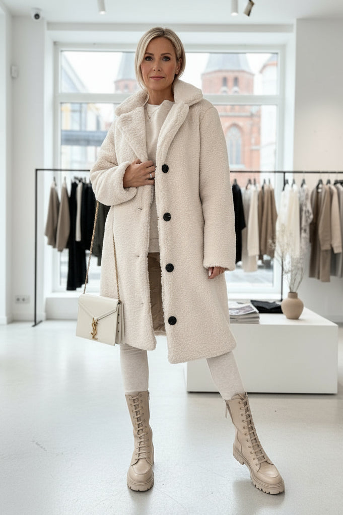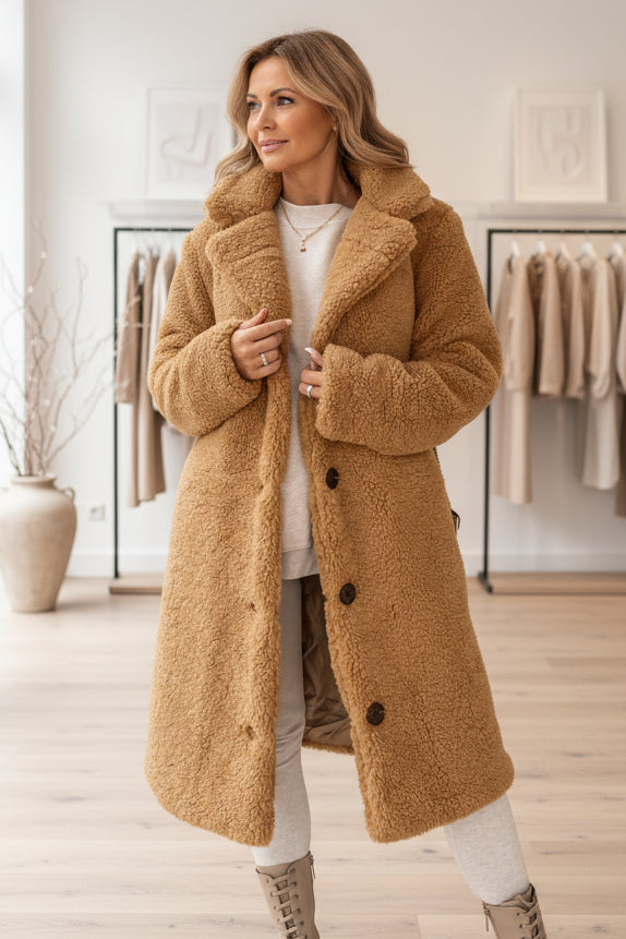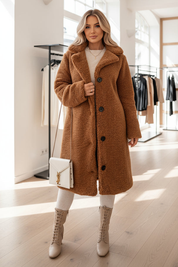 Dieser lange Teddy-Mantel vereint luxuriösen Kuschelkomfort mit zeitloser Eleganz – ideal für kalte Tage, an denen du dich stilvoll und rundum geborgen fühlen möchtest.