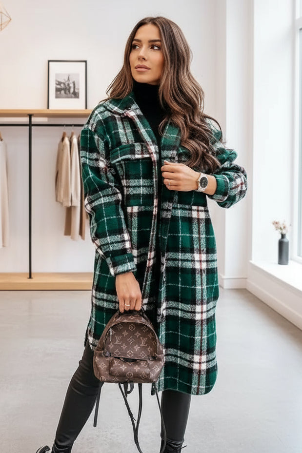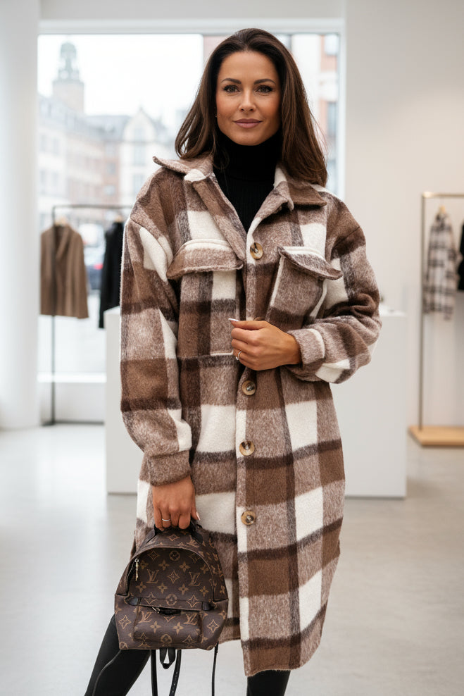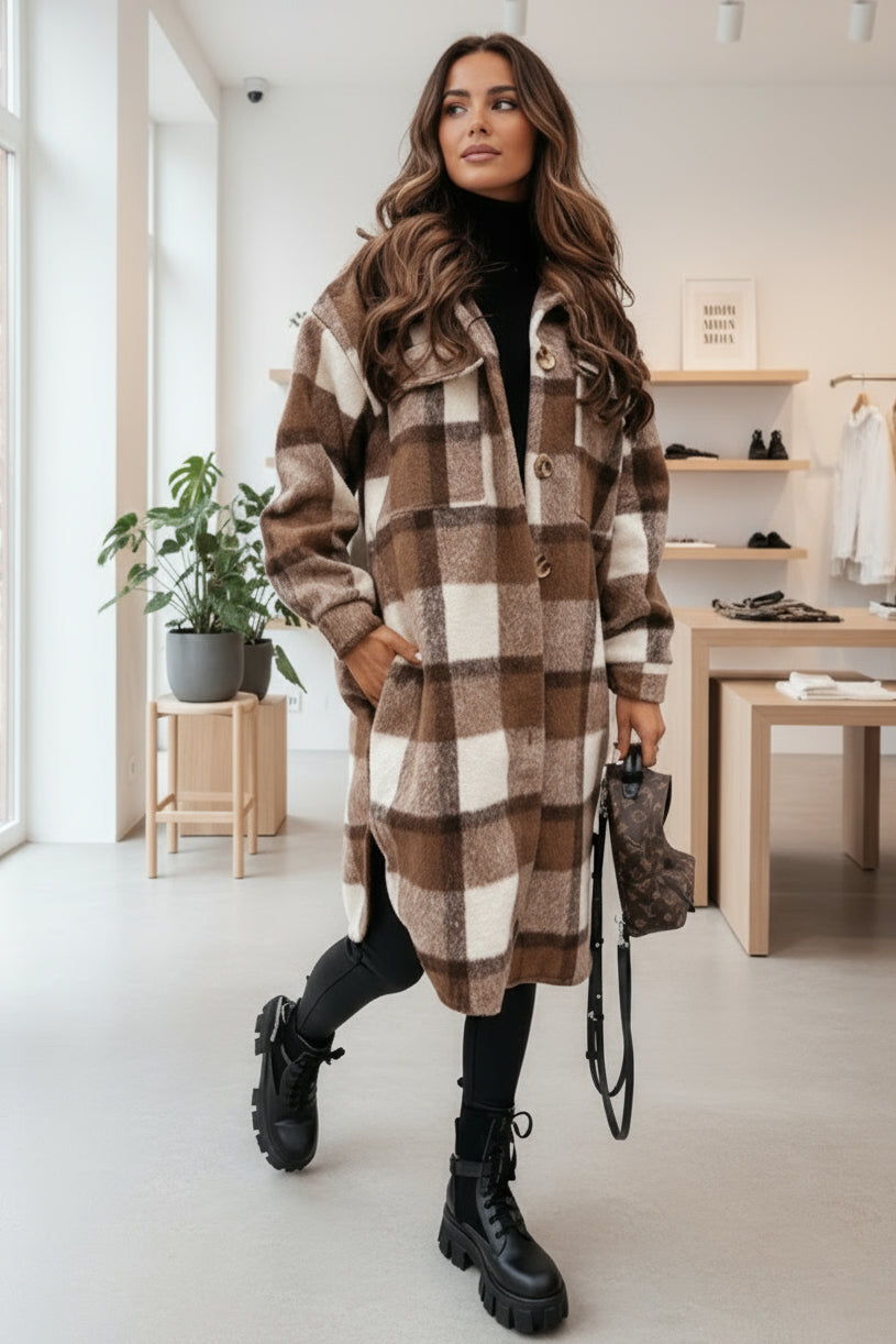 Dieser karierte Mantel bringt moderne Coolness und gemütlichen Tragekomfort perfekt zusammen. Mit seinem langen Schnitt und dem weichen Material ist er der ideale Begleiter für kühle Tage. Das zeitlose Karomuster in harmonischen Naturtönen sorgt für einen modernen Look, der sich vielseitig kombinieren lässt – von casual bis chic.