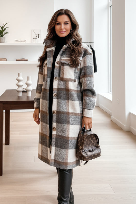 Modernes Karomuster: Die Kombination aus Beige-, Braun- und Grautönen verleiht dem Mantel einen stilvollen und zugleich zeitlosen Charakter, der nie aus der Mode kommt.