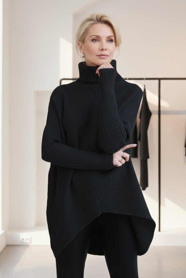 Dieser Rollkragenpullover überzeugt mit schlichter Eleganz und gemütlichem Tragekomfort. Der lockere Schnitt sorgt für Bewegungsfreiheit und kaschiert kleine Problemzonen, während der hohe Kragen dich angenehm warmhält. Die asymmetrische Saumlinie verleiht dem Look eine moderne, stilvolle Note.
