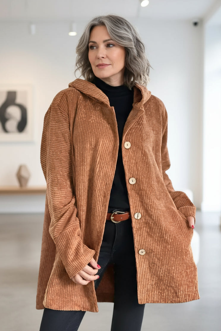 Diese Jacke aus weichem Cordstoff in tiefem Bordeauxrot ist ein echtes Wohlfühlteil mit modischer Ausstrahlung. Die großzügige Kapuze, die seitliche Knopfleiste und die lässige Passform machen sie zum perfekten Begleiter für kühle Tage. Ein Must-have für alle, die Komfort lieben, aber auf Stil nicht verzichten wollen.