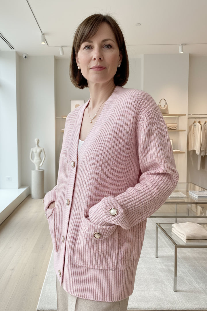 Diese rosafarbene Strickjacke verleiht deinem Outfit sofort eine elegante Note – mit liebevollen Details wie funkelnden Schmuckknöpfen, weichem Rippstrick und einer gemütlich-lockeren Passform ist sie ein echtes Highlight für deine Garderobe.