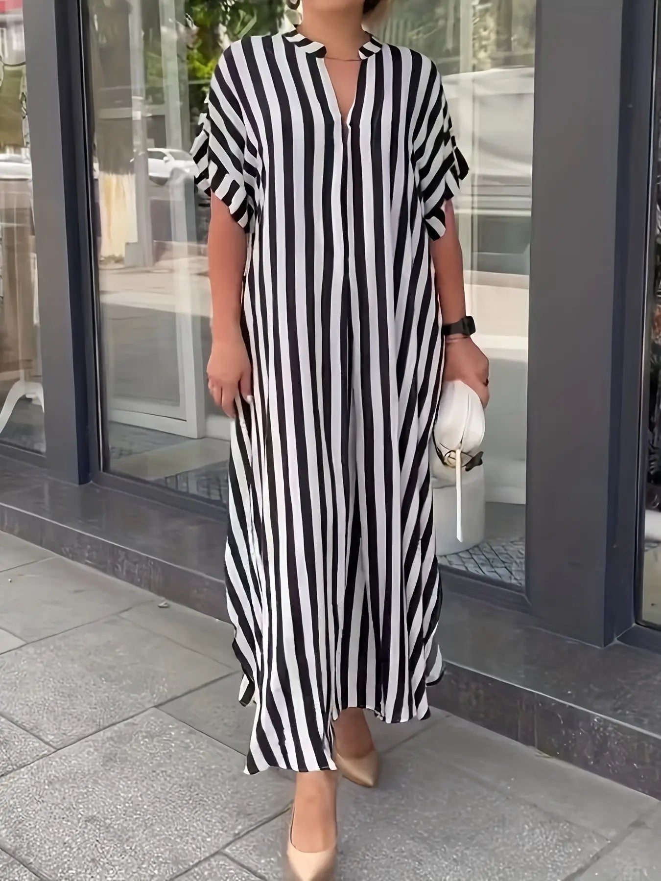Dieses gestreifte Maxikleid vereint stilvolle Lässigkeit mit zeitloser Eleganz. Das schwarz-weiße Streifendesign streckt optisch die Silhouette, während der fließende Stoff und die lockere Passform einen mühelosen Chic verleihen.