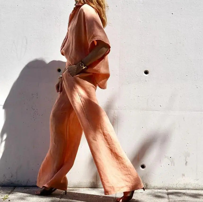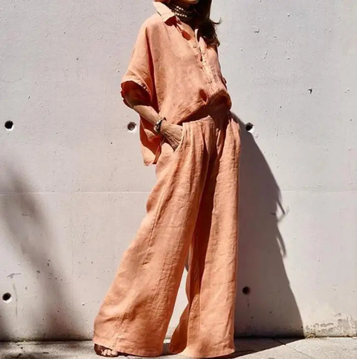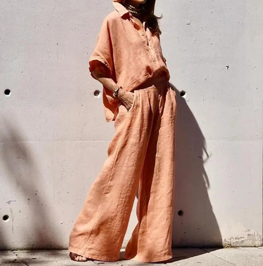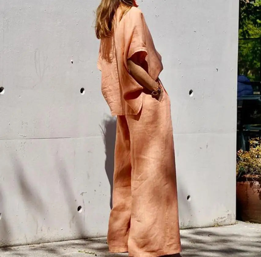 Dieses Zweiteiler-Set vereint Komfort und Stil in perfekter Balance. Das weite Bein der Hose und die locker fallende Bluse sorgen für eine mühelose Silhouette, während der fließende Stoff aus einer hochwertigen Baumwoll-Leinen-Mischung angenehm luftig bleibt.