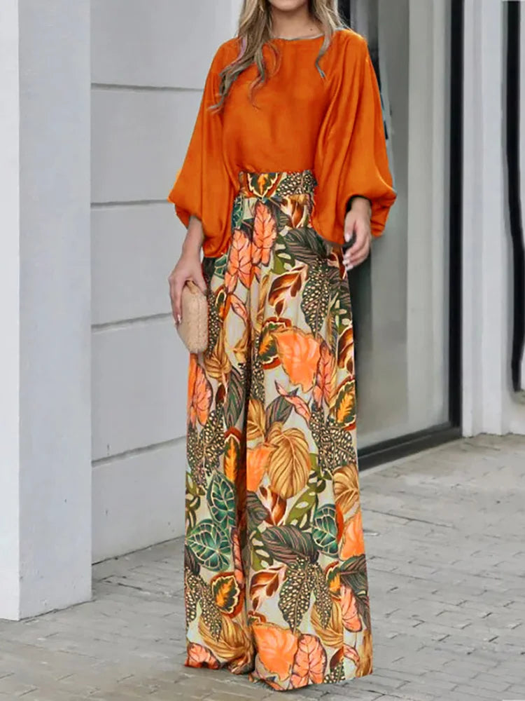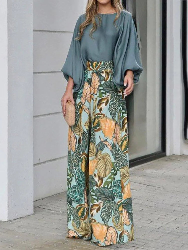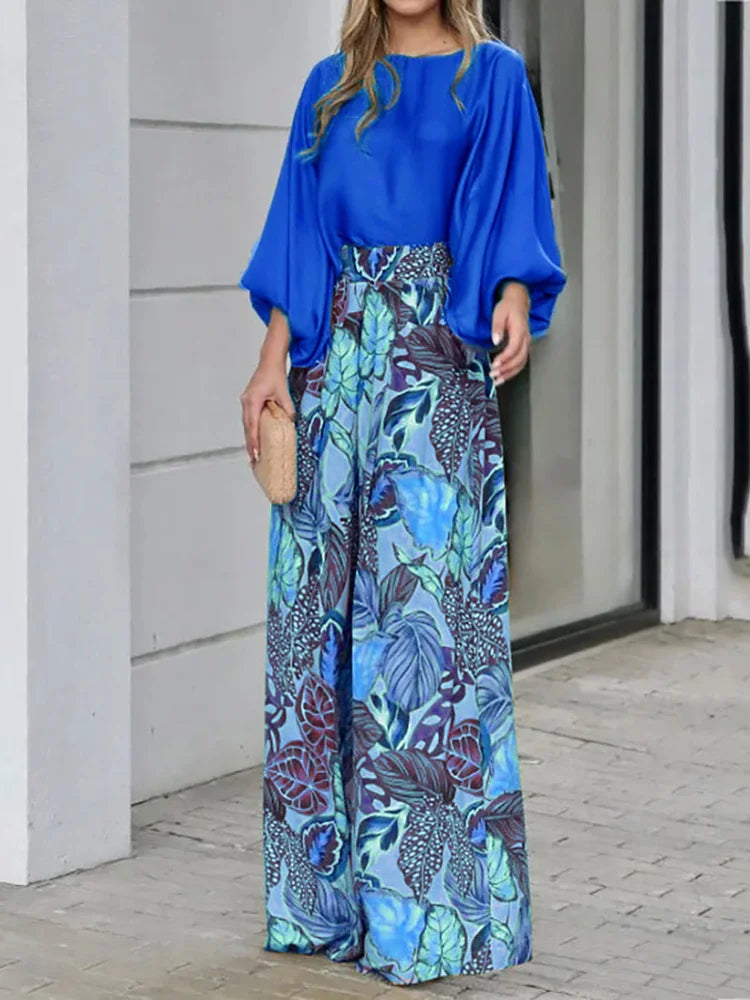 Dieses Zweiteiler-Set verleiht deinem Look eine frische, lebendige Note. Die fließende, weite Hose mit tropischem Muster harmoniert perfekt mit dem locker fallenden Oberteil in kräftigem Blau – ein Ensemble, das Leichtigkeit und Ausdruck vereint.